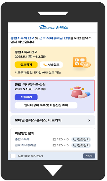 - 손택스 모바일 앱 설치 후 로그인 > 근로 자녀장려금 신청 메뉴 선택