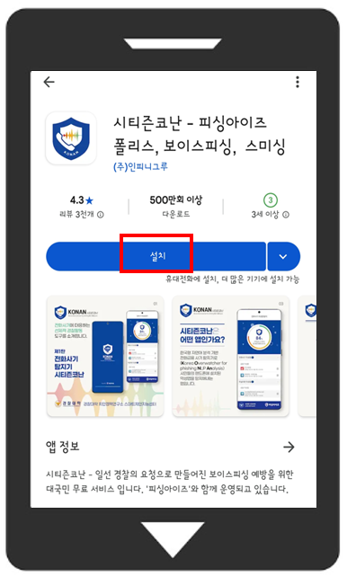 2. 시티즌코난-피싱아이즈 폴리스, 보이스피싱, 스미싱 어플을 조회 후 설치합니다.