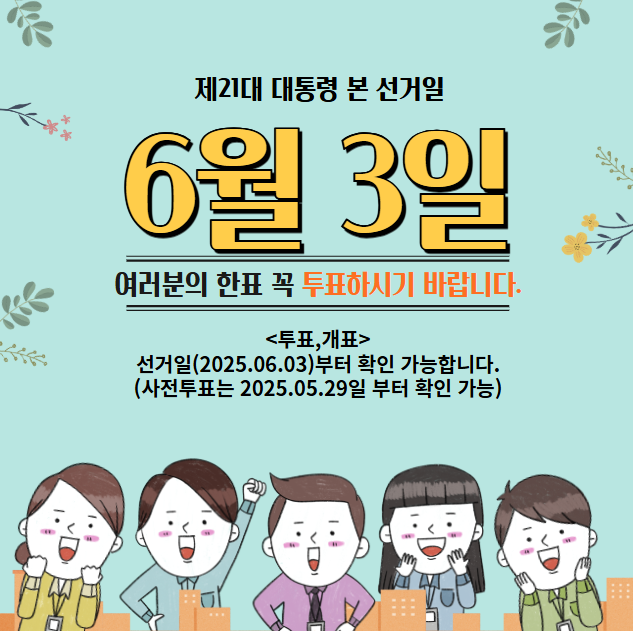 2025년 6월 3일 제21대 대통령 선거가 다가오고 있습니다. 대통령 선거는 우리의 미래를 결정짓는 정말 중요한 국민의 권리입니다. 사전투표 일정과 사전투표소 장소에 대한 정보를 확인하셔서 투표를 놓치지 마시기 바랍니다.
